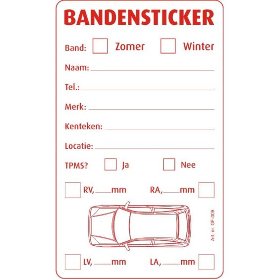 Bandenstickers voor zomer- en winterbanden, bedrukt met rood invulsjabloon om zelf in te vullen. Alle relevante bandeninformatie kan verwerkt worden: type band (voor zomer of winter), kenteken auto, garagelocatie en bandenprofiel per band. Extra informatie, zoals een bandenspanningssensor TPMS, kan ook worden genoteerd.