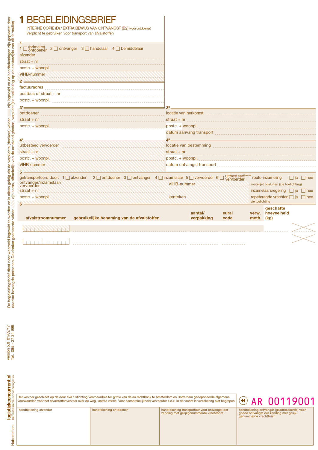 Een begeleidingsbrief is verplicht voor het transport van afval. Deze handset is een set in 3-voud in de volgorde 1-2-3 op zelfdoorschrijvend papier. De handset bestaat uit 3 losse vellen die verlijmd zijn aan de kop. De handset is geschikt voor handmatig gebruik, wat het ideaal maakt voor bijvoorbeeld gebruik in de vrachtwagencabine. Op basis van de Wet Milieubeheer dient bij het transport van afvalstoffen altijd een begeleidingsbrief aanwezig te zijn. Onze begeleidingsbrieven zijn goedgekeurd door Stichting Vervoeradres. Hierover zijn retributiekosten afgedragen en de nummerreeksen zijn geregistreerd bij Stichting Vervoeradres.