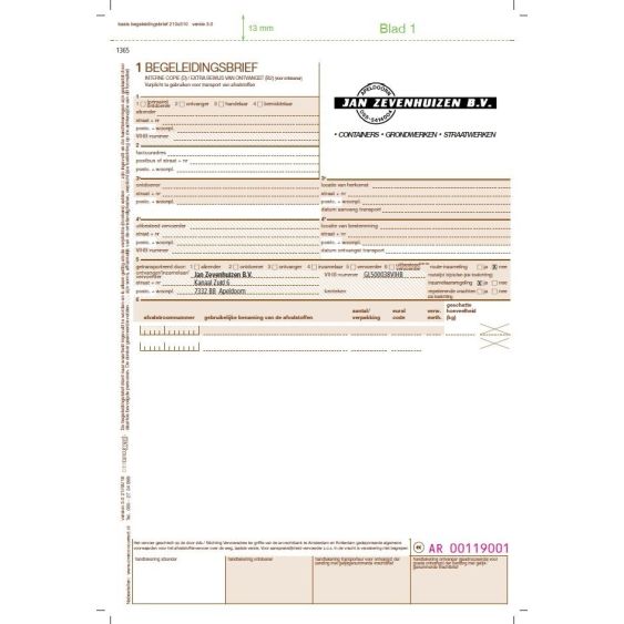 Op basis van de Wet Milieubeheer dient bij het transport van afvalstoffen altijd een begeleidingsbrief aanwezig te zijn, die uniek genummerd moet zijn. Onze begeleidingsbrieven zijn goedgekeurd door Stichting Vervoeradres, hierover zijn retributiekosten afgedragen en de nummerreeksen zijn geregistreerd bij Stichting Vervoeradres. Het is een set in 4 voud (verlijmd aan de kop) op zelf doorschrijvend papier en geschikt voor handmatig gebruik en erg handig in de vrachtwagencabine.