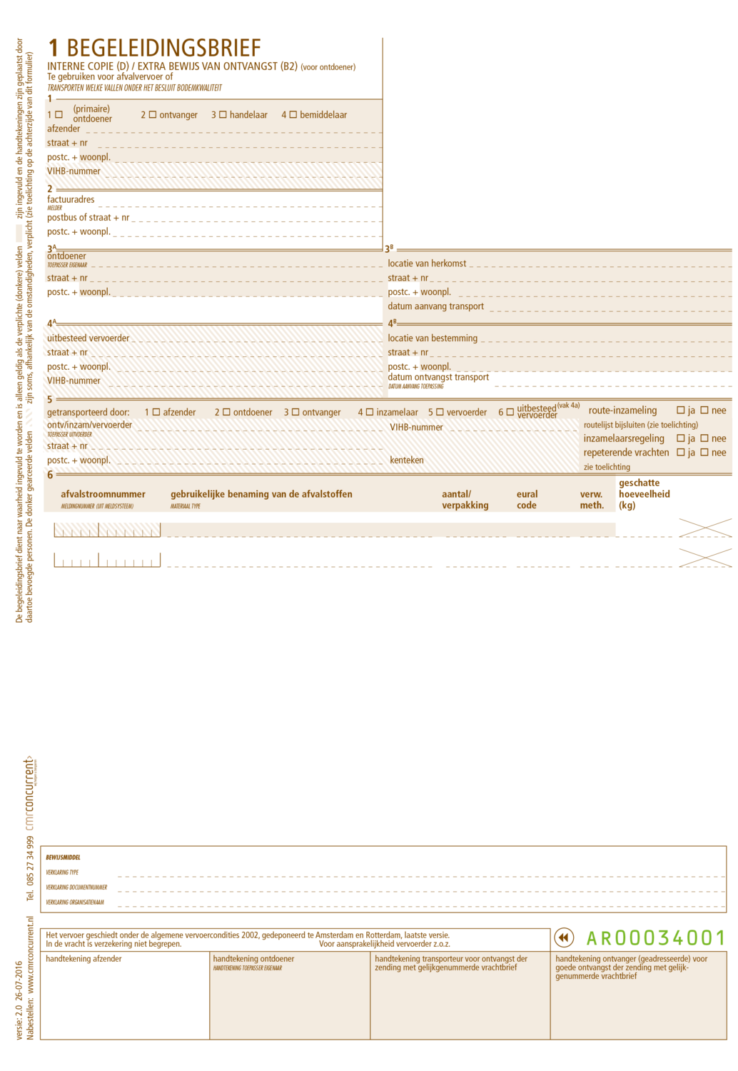 Begeleidingsbrief in 4-voud met indruk in zwart. Deze vrachtbrief is geschikt voor het afvoeren van afvalstoffen die vallen onder het besluit bodemkwaliteit. Deze set bestaat uit 4 exemplaren met het formaat van 12” x 240 mm. De set is geschikt voor gebruik in matrixprinters en is gedrukt op hoogwaardig zelfdoorschrijvend papier. Door crimplocks en tapeflex zijn de losse exemplaren gebundeld tot set. Onze begeleidingsbrieven zijn goedgekeurd door Stichting Vervoeradres, hierover zijn retributiekosten afgedragen. De nummerreeksen zijn geregistreerd bij Stichting Vervoeradres. Voor dit product geldt een minimale afname van 1000 stuks.