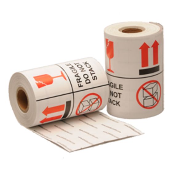 Fragile/do not stack behandelingsetiket bestaande uit tekst en pictogrammen. De zelfklevende papieren etiketten zijn eenvoudig aan te brengen op verzenddozen en pakketten. De etiketten worden geleverd per rol van 1000 labels en hebben een formaat van 100 x 100 mm. Het stevige hoogglans witte papier is voorzien van een permanente lijmlaag, waardoor het etiket gedurende het gehele verzendproces blijft kleven. De pictogrammen zijn herkenbaar en waarschuwen dat het om een breekbaar product gaat, dat er niet op de verpakking gestapeld mag worden en welke kant van de verpakking de bovenkant is.