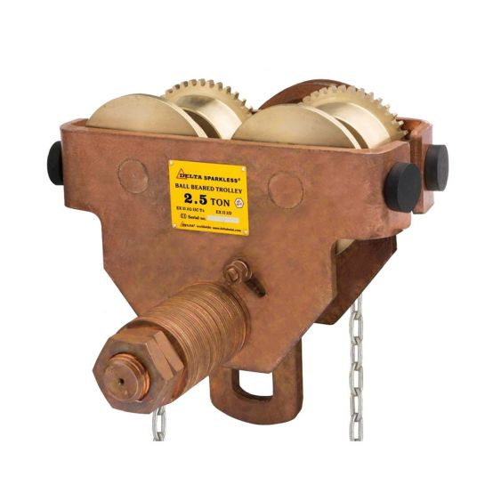 Vonkvrije kettingloopkat van het merk Delta. Een loopkat is een wagen met 4 wielen en 2 zijwangen die op de flens van een balk rijdt. De kettingloopkat kan vanaf de grond verplaatst worden door aan de ketting te trekken. De kettingloopkat is vonkvrij en daardoor geschikt voor potentieel gevaarlijke en explosieve omgevingen.