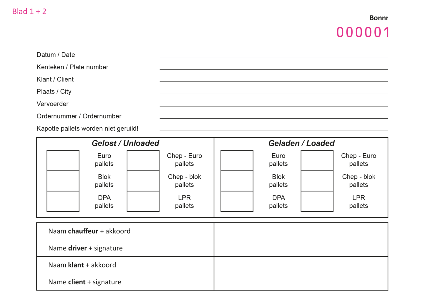 De palletbonennboekjes zijn uitgevoerd in een handzaam formaat (A5), eenvoudig in chauffeursjack op te bergen en unieke genummerd. Van toepassing voor alle soorten emballage, standaard voorgedrukt voor: