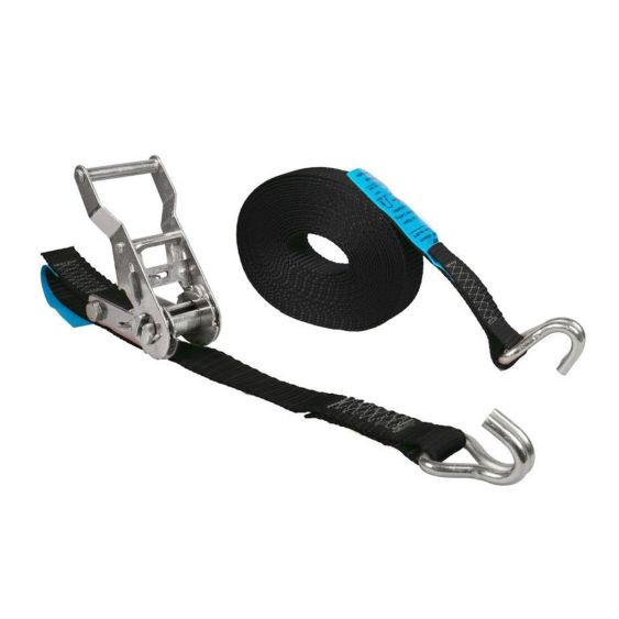 Complete 2-delige spanband in de kleur zwart. De spanband heeft een bandbreedte van 35 mm en is 5 meter lang. De ratel en de haken van de spanband zijn gemaakt van RVS. Roestvrij staal heeft een aantal voordelen ten opzichte van gewoon staal. Zo is RVS watervast en kan het tegen alle weersomstandigheden. Zowel het rateldeel als het spandeel is voorzien van een RVS spitshaak. De spanband heeft een sterkte van 2000 daN bij rondsjorren (omsnoeren), een sterkte van 1000 daN bij kopsjorren (diagonaal sjorren) en een sterkte van 100 daN (STF) bij kracht zekeren (neerbinden).